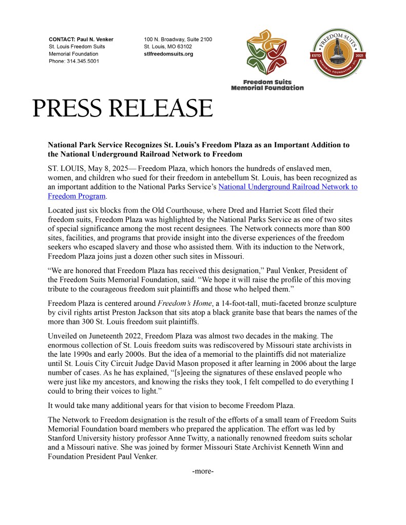 Located just six blocks from the Old Courthouse, where Dred and Harriet Scott filed their freedom suits, Freedom Plaza was highlighted by the National Parks Service as one of two sites of special significance among the most recent designees. The Network connects more than 800 sites, facilities, and programs that provide insight into the diverse experiences of the freedom seekers who escaped slavery and those who assisted them. With its induction to the Network, Freedom Plaza joins just a dozen other such sites in Missouri.
