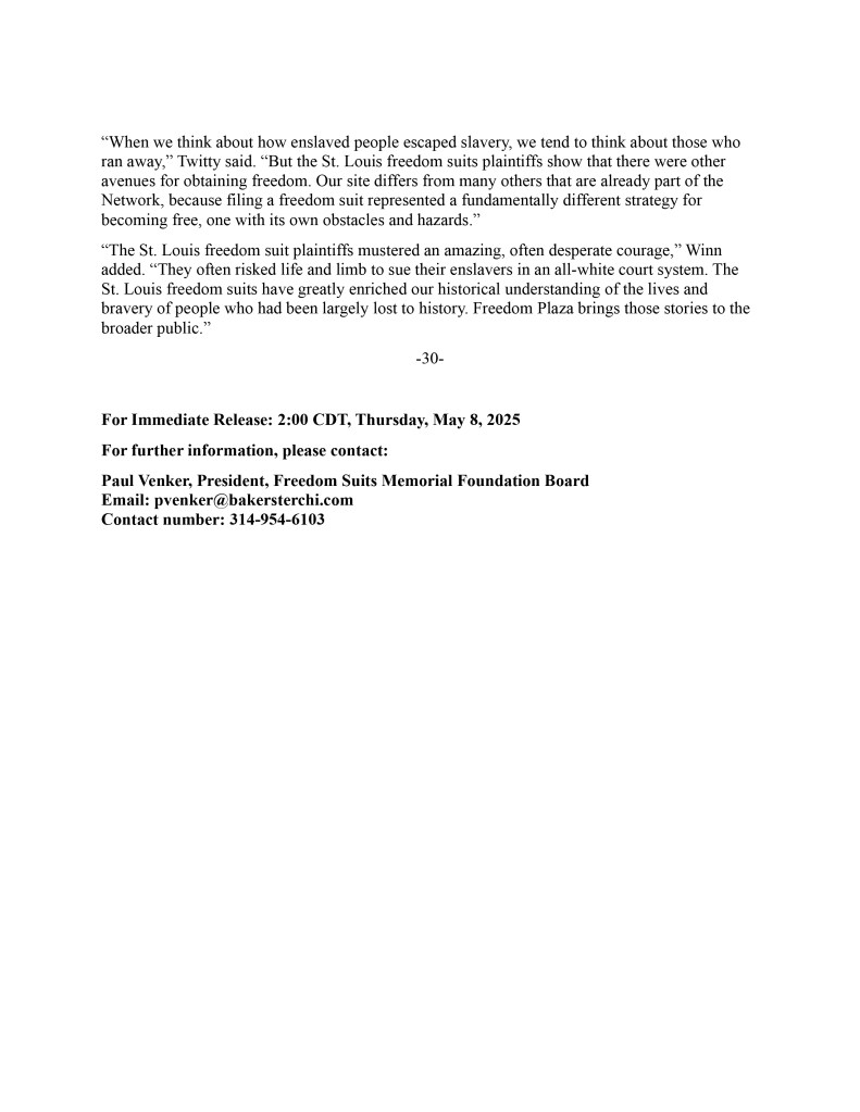 “The St. Louis freedom suit plaintiffs mustered an amazing, often desperate courage,” Winn added. “They often risked life and limb to sue their enslavers in an all-white court system. The St. Louis freedom suits have greatly enriched our historical understanding of the lives and bravery of people who had been largely lost to history. Freedom Plaza brings those stories to the broader public.”